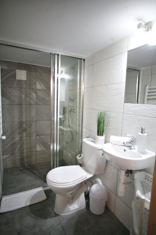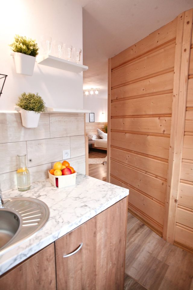 Składa się z 2 oddzielnych pomieszczeń, aneksu kuchennego i łazienki z WC.