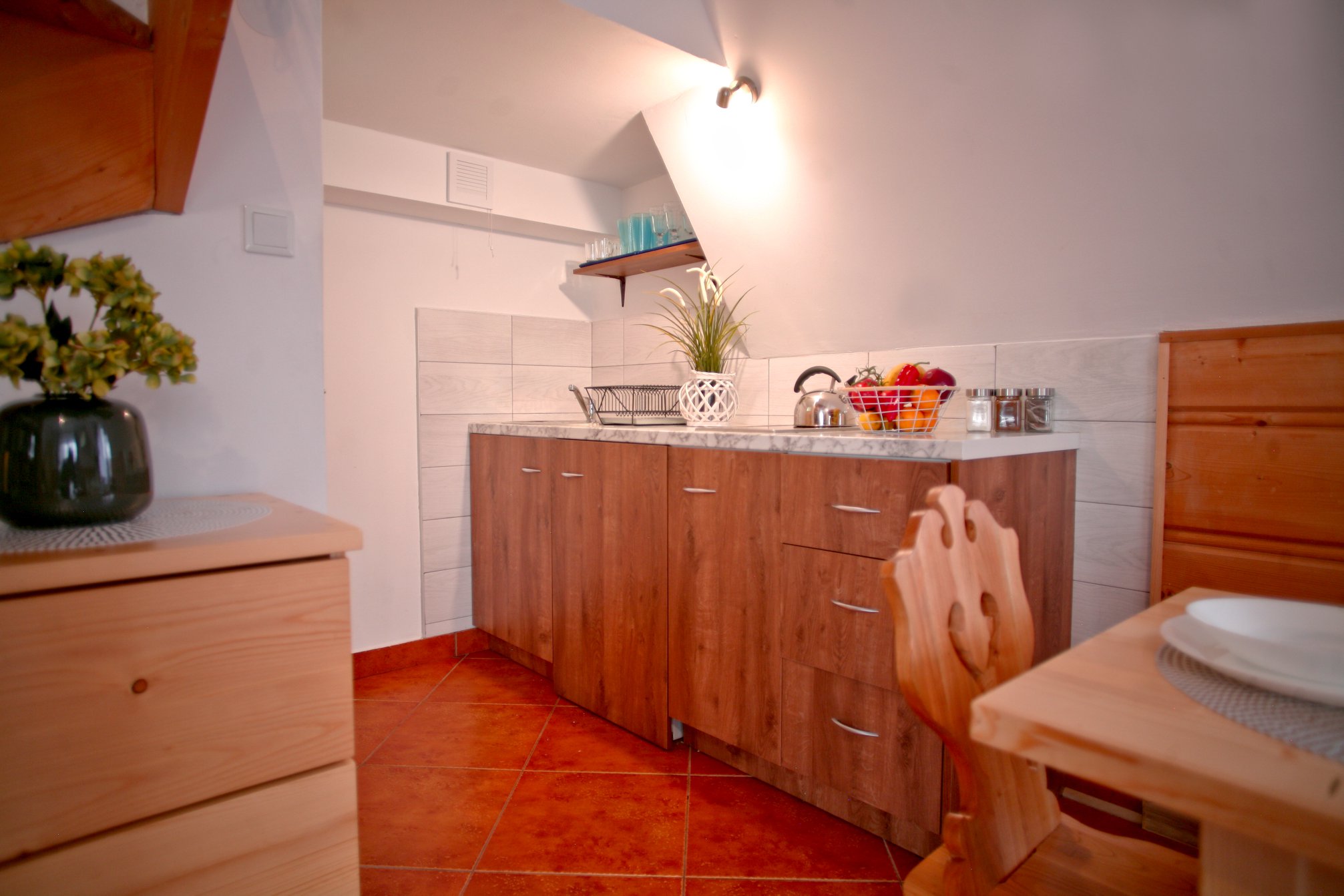 Apartament posiada 2 oddzielne sypialnie, piękny duży taras z widokiem na górę Nosal, aneks kuchenny i łazienkę z Wc i prysznicem.